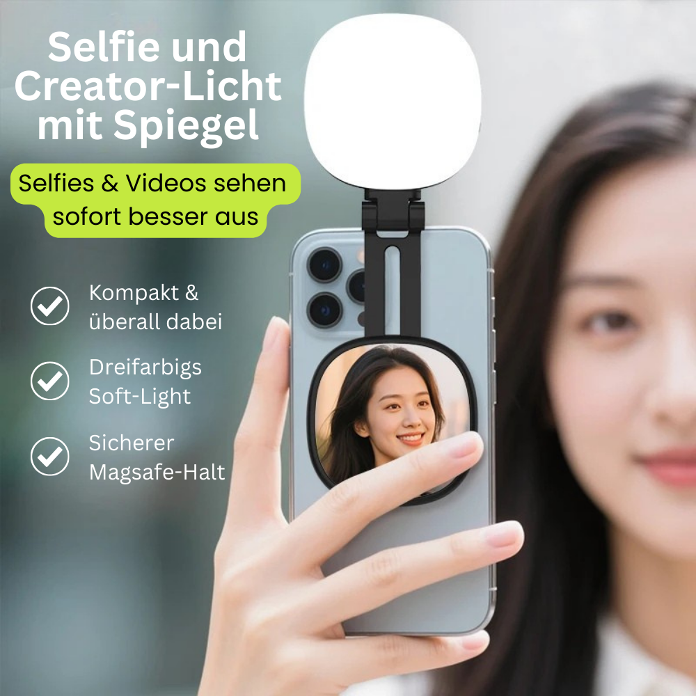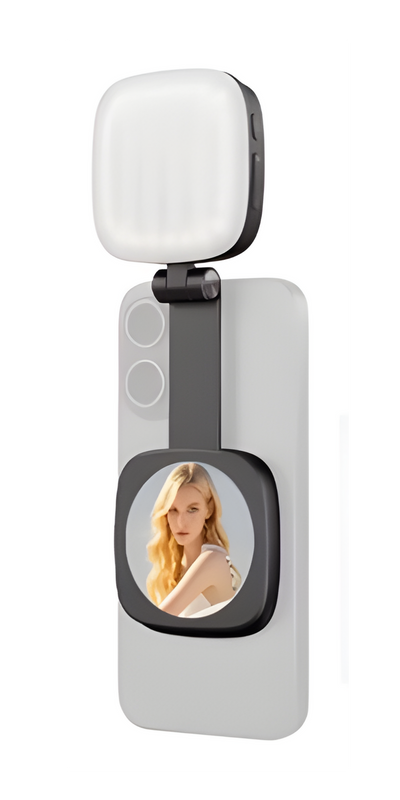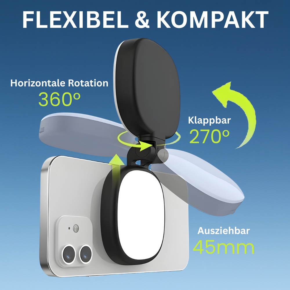 Magnetisch, drehbar & mit Spiegel für Hauptkamera-Shots – immer ready, wenn du gut aussehen willst.