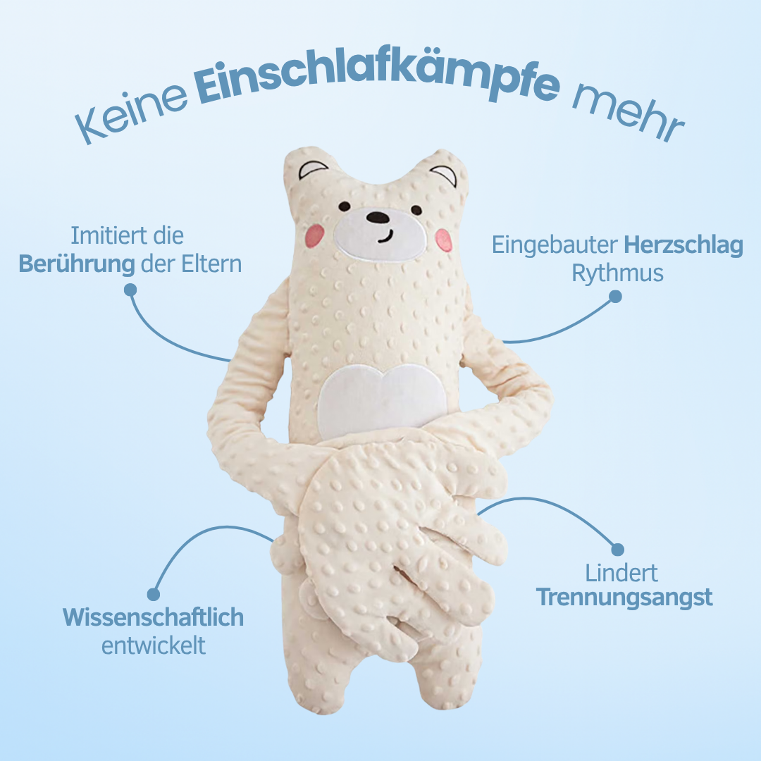 "Ich hätte nie gedacht, dass so ein Kuscheltier so viel bewirken kann! Der Herzschlag beruhigt unseren Sohn sofort. Wir nehmen ihn sogar auf Reisen mit."
