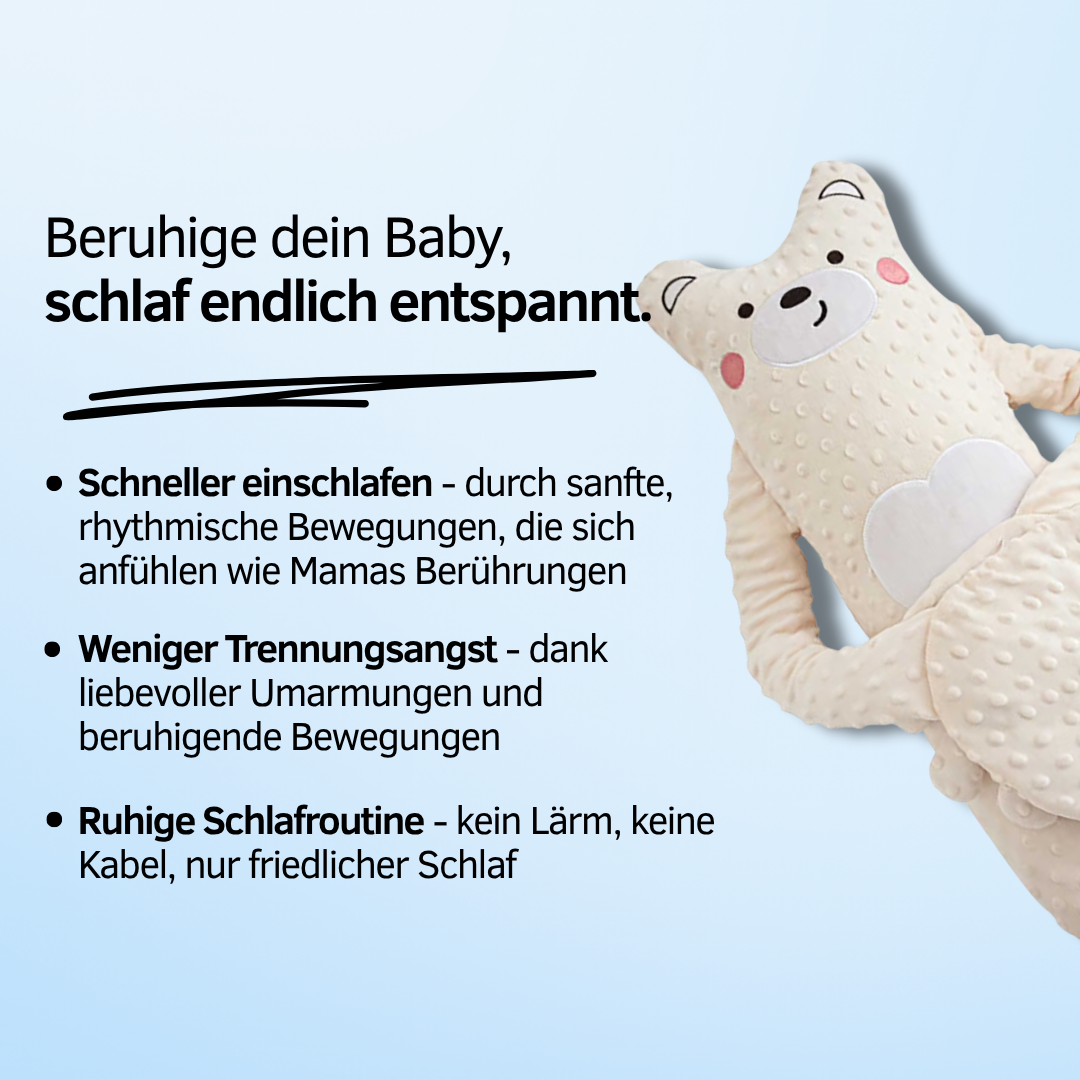 Der innovative Motor sorgt für eine gleichmäßige, beruhigende Klopfbewegung – so sanft wie der Herzschlag einer Mutter. Dieses rhythmische Klopfen hilft deinem Baby, sich zu entspannen, reduziert Unruhe und fördert längere, tiefere Schlafphasen – Nacht für Nacht.