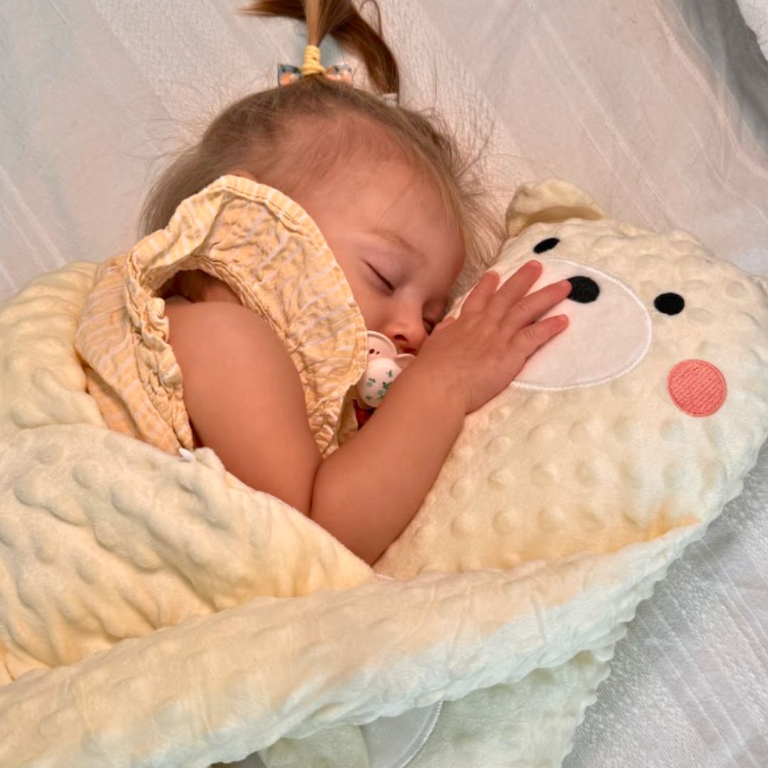 "Unsere kleine Mia hatte große Schwierigkeiten einzuschlafen. Seit wir den Bären haben, ist es jeden Abend viel entspannter. Sie schläft in wenigen Minuten ein!"